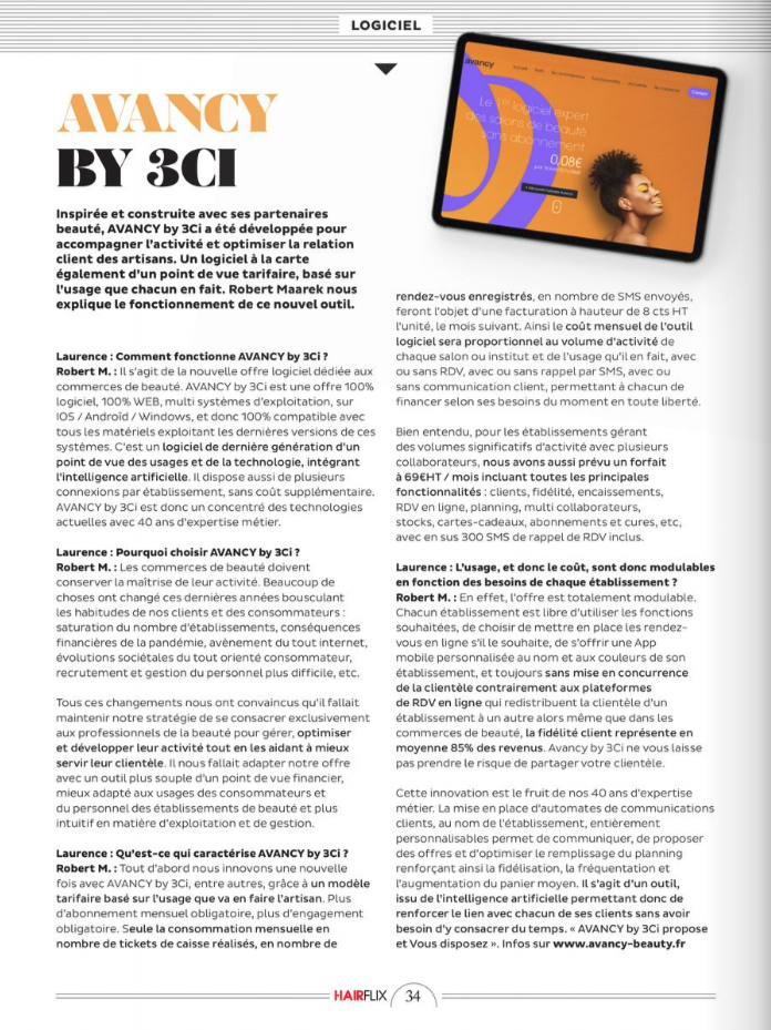 Dans le dernier numéro du magazine HAIRFLIX. Robert Maarek, président de 3Ci est interviewé pour présenter Avancy by 3Ci.